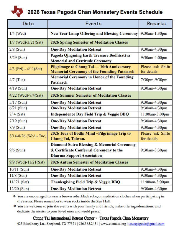 2026 Spring Texas Pagoda Chan Monastery Meditation Classes