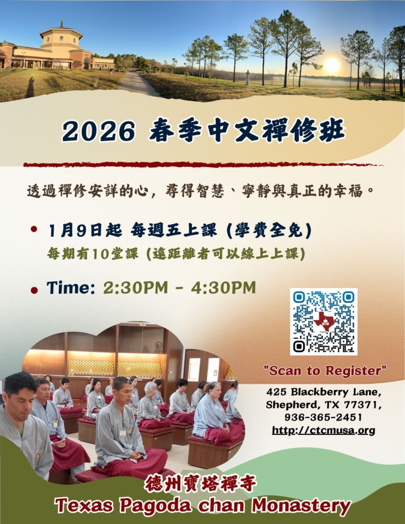 2026 德州寶塔禪寺 — 春季中文禪修班 一月九日(週五)開始上課!