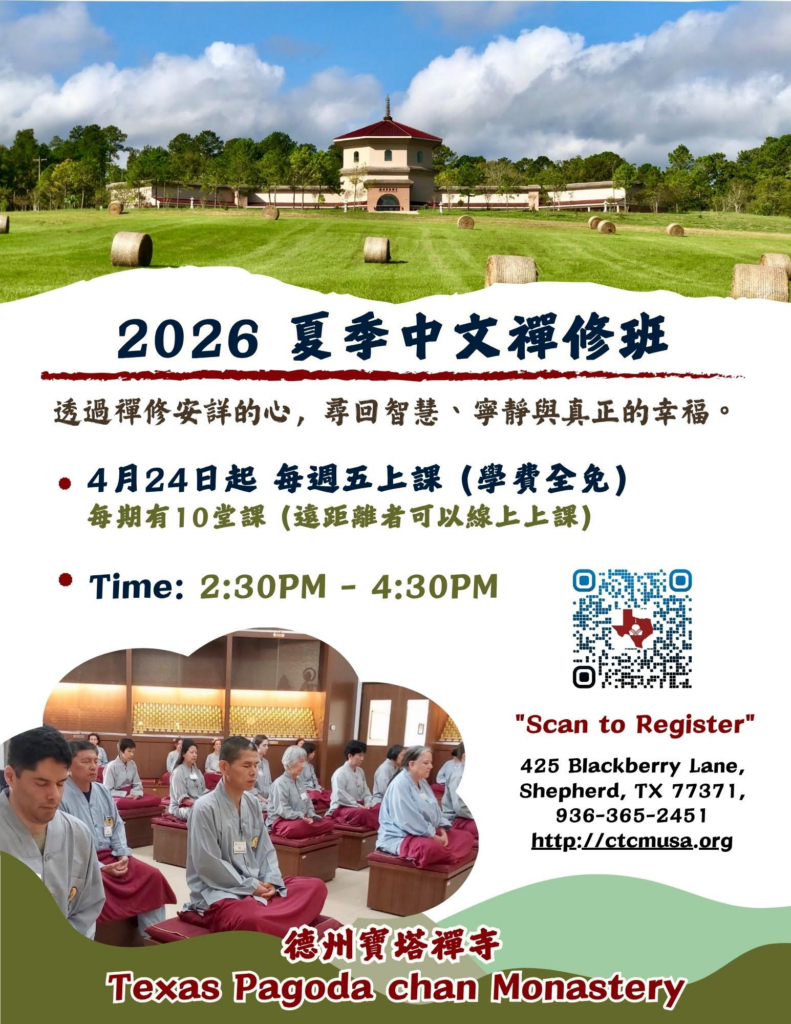 德州寶塔禪寺 —夏季中文禪修班開課 4月24日起 每週五上課 2:30 pm – 4:30 pm (德州時間 CST) !