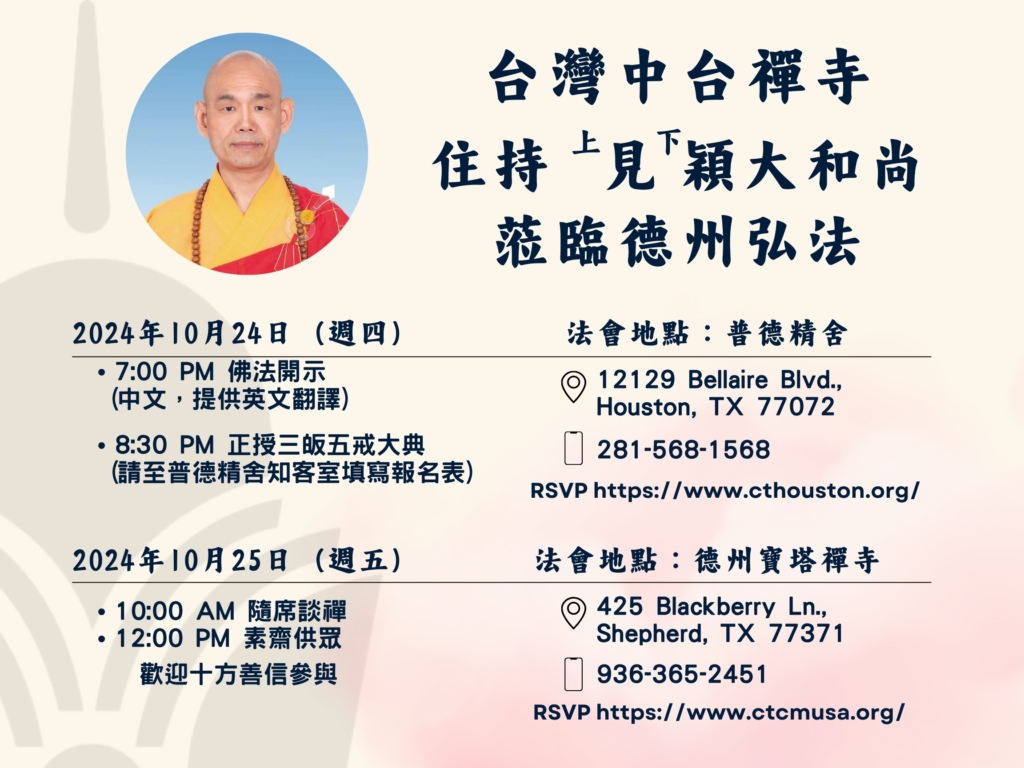 歡迎報名參加台灣 中台禪寺 住持 見穎大和尚10月蒞臨德州弘法活動