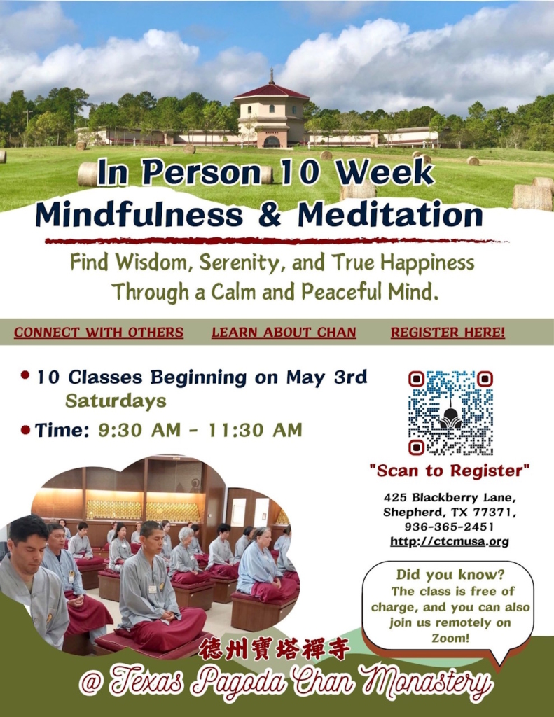 🧘🏻♀️ Free Meditation classes guided by ordained masters are held in the Texas pagoda.