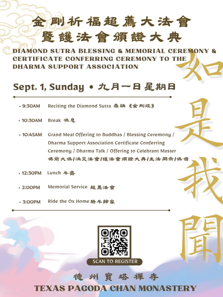September 1 (Sunday) 9:30-15:00 Chung Tai International Retreat Center. Texas Pagoda Chan Monastery organizes the Diamond Sutra Blessing & Memorial Ceremony & Certificate Conferring Ceremony to the Dharma Support Association, inviting all of you to join us in making vigorous efforts and dedicating the blessings of world peace, national prosperity, and civil tranquility, and sentient beings of the Dharma realm, all of whom will reach the shore of enlightenment together.