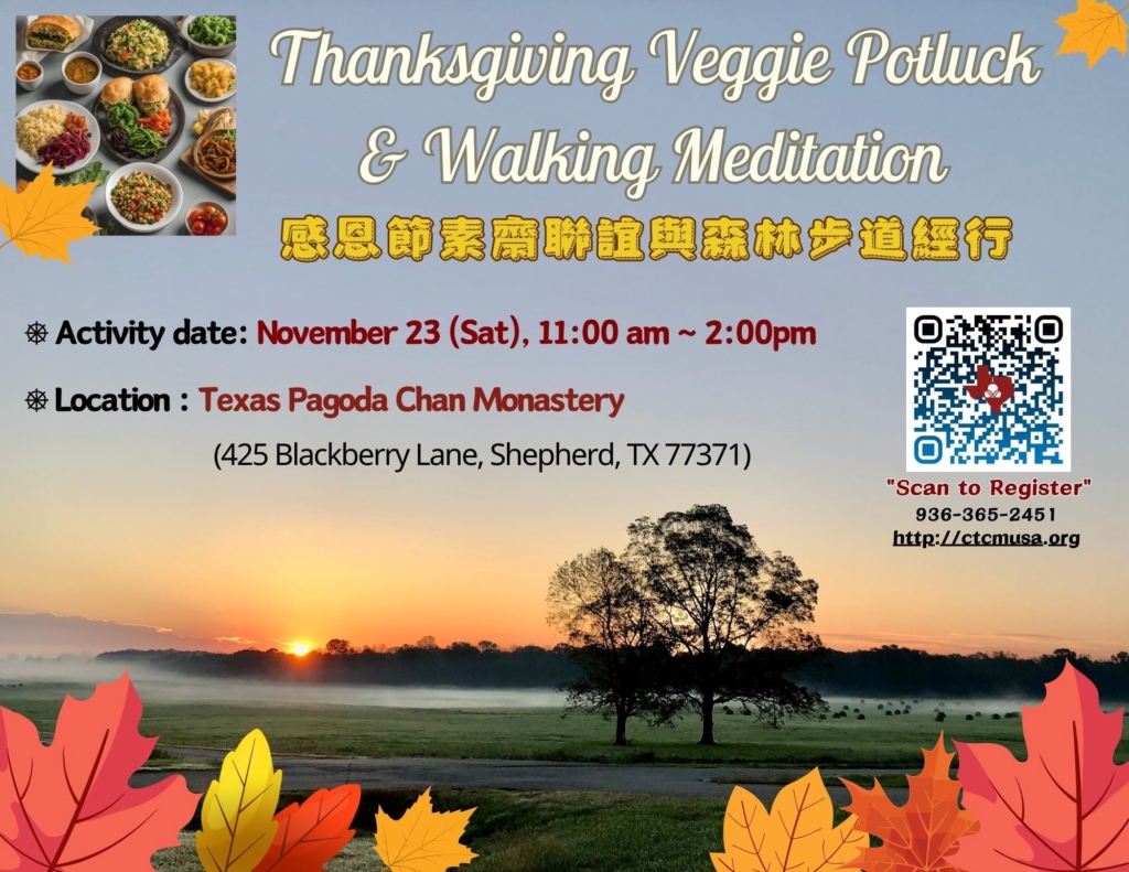 As Thanksgiving approaches, Texas Pagoda Chan Monastery warmly invites you to join us for a Thanksgiving Veggie Potluck and a Forest Trail Walking Meditation to celebrate this season of gratitude together.