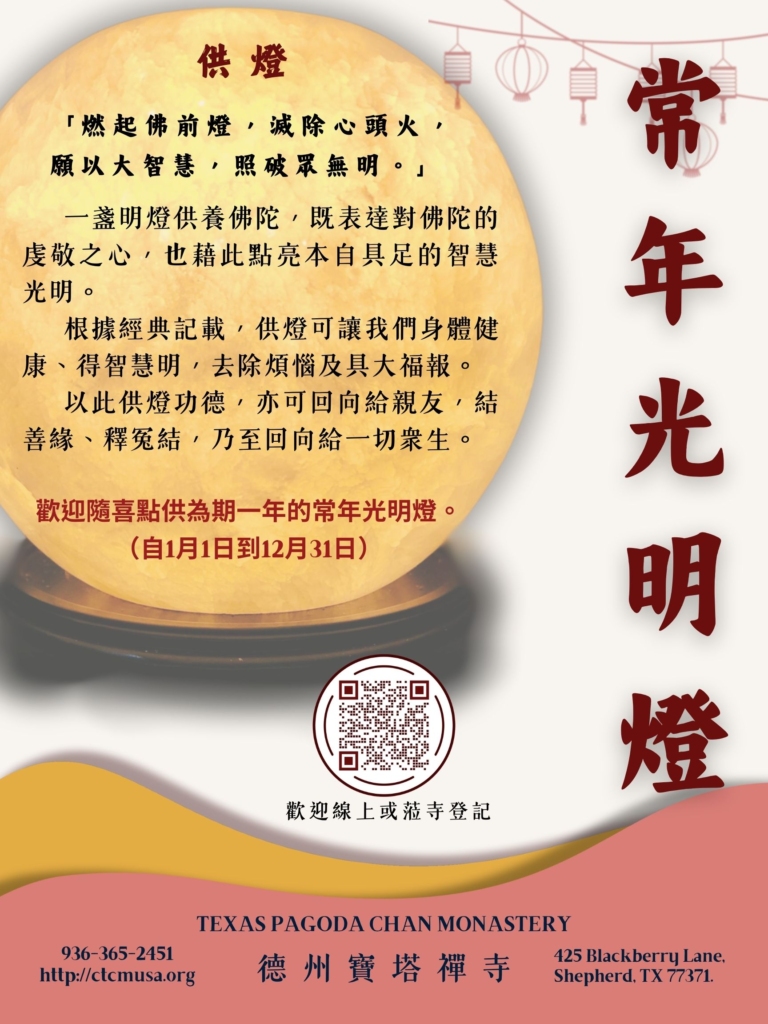 點供常年光明燈 「燃起佛前燈,滅除心頭火,願以大智慧,照破眾無明。」 一盞明燈供養佛陀,既表達對佛陀的虔敬之心,也藉此點亮本自具足的智慧光明。 根據經典記載,供燈可讓我們身體健康、得智慧明,去除煩惱及具大福報。 以此供燈功德,亦可回向給親友,結善緣、釋冤結,乃至回向給一切衆生。歡迎 隨喜點供 德州寶塔禪寺為期一年的常年光明燈。(自1月1日到12月31日)請按此填寫登記表。https://forms.gle/gpo6kjwkeerDYoxG9